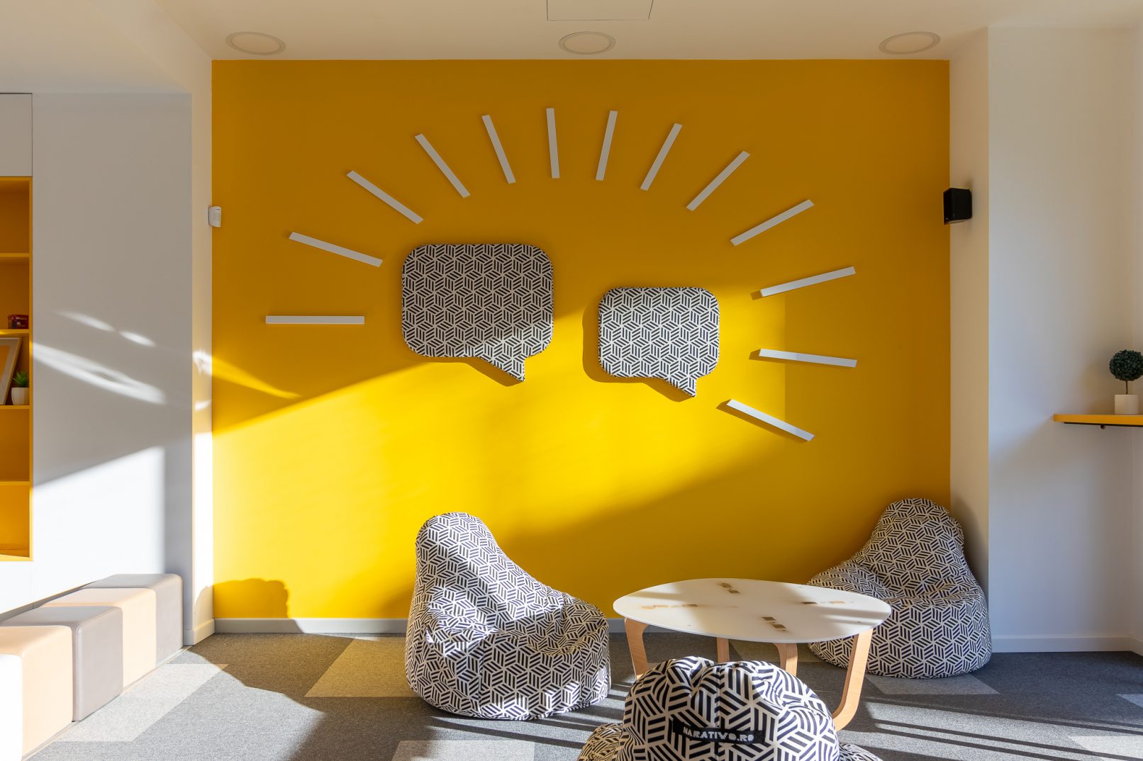 The brief of this project asked for a visually engaging and stimulative environment that would infuse the office with a specific character. The large glazings on both sides determined the functional layout with all closed spaces grouped in the middle. The main elements like ceiling, cabinets, as well as smaller items like custom-made pieces of furniture, textiles, wallpaper, decorations are all derived from the same aesthetic concept of geometrical patterns, white/grey/yellow colours and a handful of honest materials.