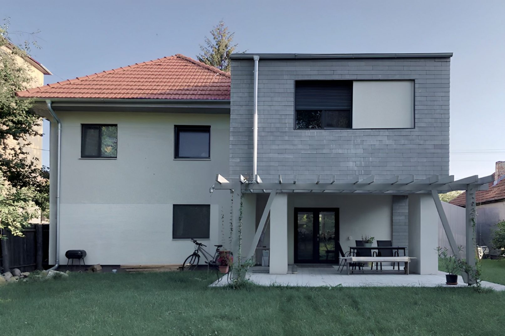 The house was also extended with a new part for a large kitchen/dining area and two smaller bedrooms upstairs. This new part is covered mostly with locally produced fibercement tiles in a ventilated system. The tuned down color scheme enhances the house’s elegant ‘Scandinavian’ vibe.