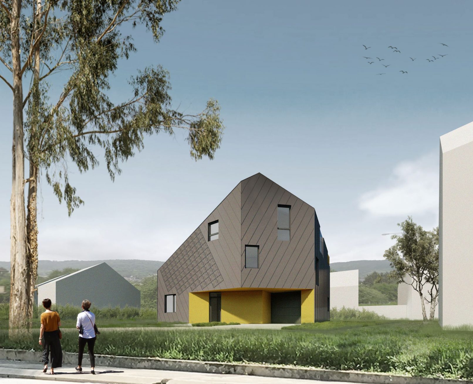 By orienting the ridge of the building in the E-V direction we maximized the southern surface of the roof to include as many photovoltaic panels as possible. This orientation also establishes the direction of the building’s vertical circulations, the other spaces being subordinated to this spatial twist, resulting in atypical geometries. This spatial tumult is also found in sections, the intermediate levels constantly creating visual dialogues between various spaces.