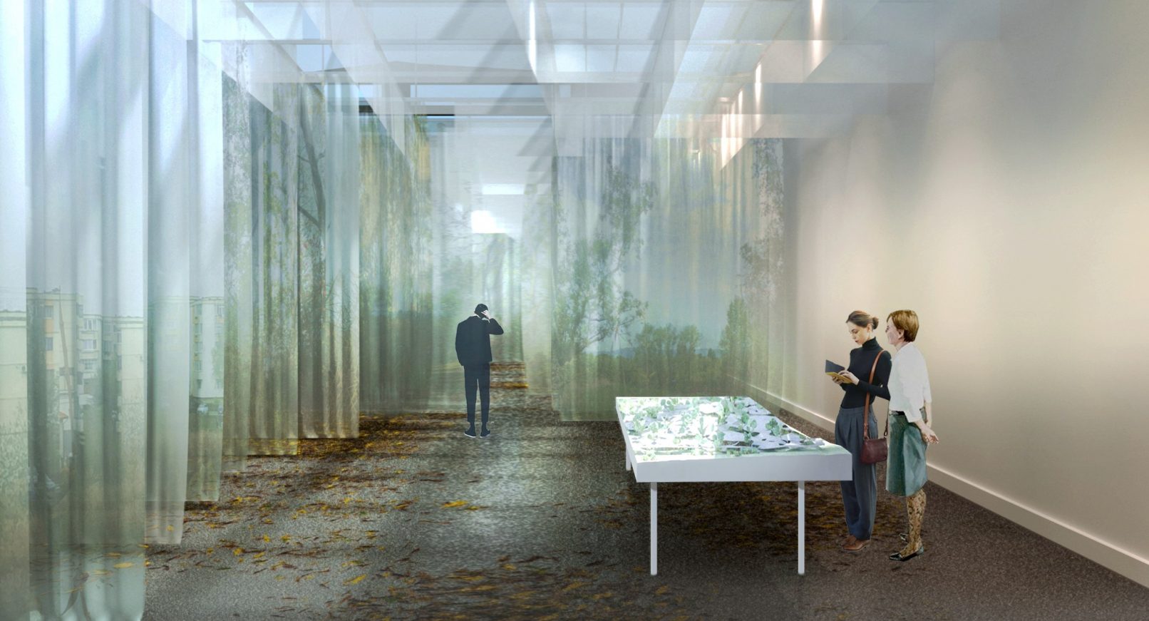 A series of printed textile layers set up a re-imagined landscape in which fragments of nature and city superimpose each other, outlining an immersive parcourse. Although it captures a diversity of environments (forest, meadows, urban fabric, wetlands, etc.), the landscape does not present a specific place, although you may discover recognizable elements of domestic landscape. In the pavilion, there is a subtle play between light, density, and movement. The vertical veil interacts with the movement of visitors and the breeze generated by electric fans. This interior environment borrows from the fragility and temporality of the landscape, it reflects the changes in intensity and colour variations of outdoor light. The floor is covered with organic material (dry leaves and tree bark), through which visitors trace their own paths. The soundscape adds depth and amplifies perception: sounds recorded in the natural environment mix naturally with the noise of ventilators. A reverie and wandering sense sets in, where the physical limits of space fade away. It becomes bare in the clearing areas, which allow for 5 exhibition spaces.